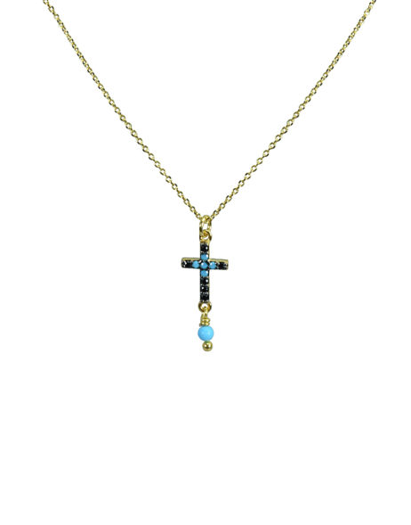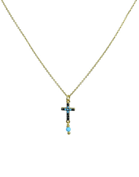 ΚΟΛΙΕ ΜΕ ΣΤΑΥΡΟ ΑΠΟ ΜΑΥΡΑ ΖΙΡΓΚΟΝ, ΤΥΡΚΟΥΑΖ ΚΑΙ ΑΛΥΣΙΔΑ (40cm) ΑΠΟ ΑΣΗΜΙ 925 ΕΠΙΧΡΥΣΟ.