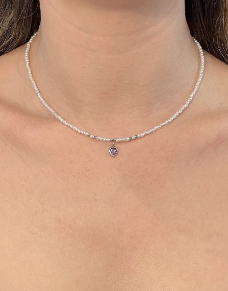 Υπέροχο χειροποίητο κολιέ με καρδιά απο αμέθυστο, shell pearls και ιδιαίτερα ασημένια στοιχεία και κούμπωμα από ασήμι 925 επιπλατινωμένο.